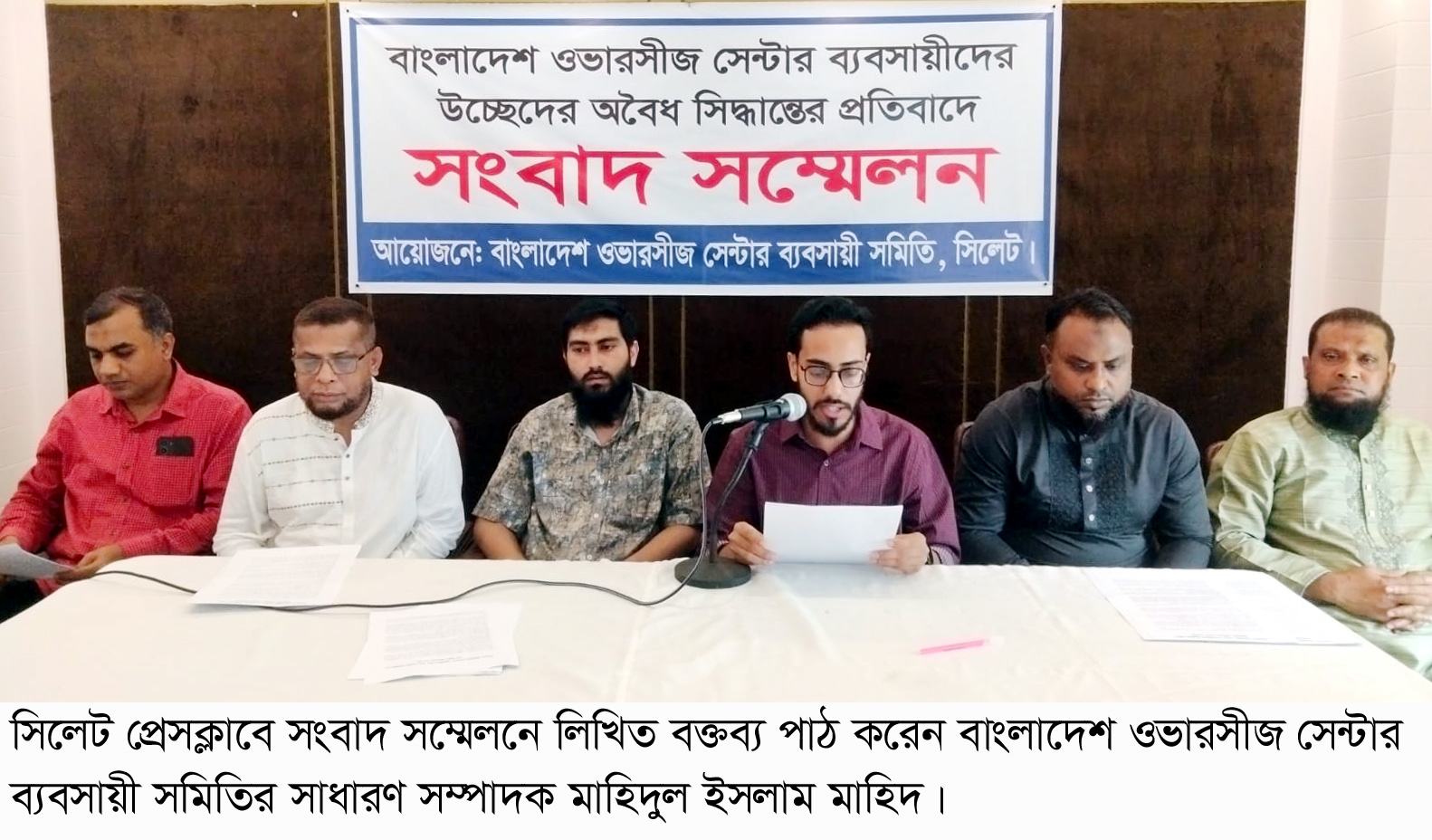 সিলেট নগরীর জিন্দাবাজারে অবস্থিত বাংলাদেশ ওভারসীজ সেন্টার মার্কেট ভবন ভাঙার সিদ্ধান্ত প্রত্যাহার এবং বর্তমান লিজগ্রহীতাদের স্থায়ী লিজ প্রদানের দাবিতে সংবাদ সম্মেলন করেছেন ব্যবসায়ীরা। তারা দাবি করেন, ২০১৯ সালে সিলেট সিটি করপোরেশনের প্রণীত নগরীর ঝুঁকিপূর্ণ ২৫ ভবনের তালিকায় ওভারসীজ সেন্টার মার্কেটের নাম ছিল না। অথচ এখন ভবনটিকে ঝুঁকিপূর্ণ দেখিয়ে উচ্ছেদের উদ্যোগ নেওয়া হয়েছে।
