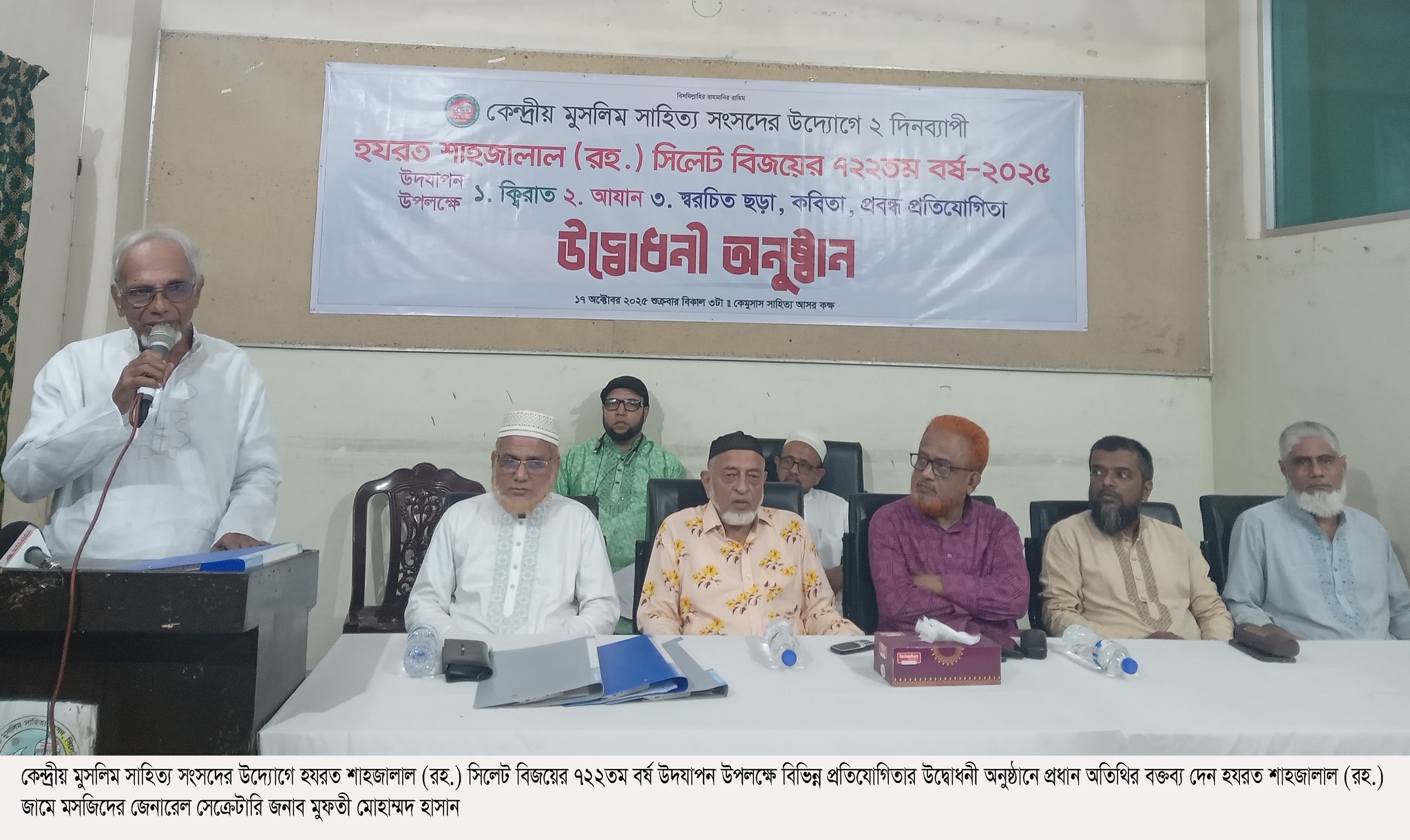 হযরত শাহজালাল (রহ.) সিলেট বিজয়ের ৭২২তম বর্ষ-২০২৫ উদযাপন উপকমিটির আহ্বায়ক রুহুল ফারুকের সভাপতিত্বে ও কেমুসাসের সাহিত্য ও গবেষণা সম্পাদক কামরুল আলমের সঞ্চাচালনায় অনুষ্ঠিত প্রতিযোগিতার উদ্বোধনী অনুষ্ঠানে প্রধান অতিথির বক্তব্য দেন হযরত শাহজালাল (রহ.) জামে মসজিদের জেনারেল সেক্রেটারি জনাব মুফতী মোহাম্মদ হাসান। অনুষ্ঠানের শুরুতে কুরআন তেলাওয়াত করেন হাফিজ আব্দুল কাদির, স্বাগত বক্তব্য দেন হযরত শাহজালাল (রহ.) সিলেট বিজয়ের ৭২২তম বর্ষ-২০২৫ উদযাপন উপকমিটির সদস্য সচিব সৈয়দ মোহাম্মদ তাহের। অন্যান্যের মধ্যে বক্তব্য দেন কেমুসাসের সহসভাপতি আফতাব চৌধুরী, সাধারণ সম্পাদক সেলিম আউয়াল, সাবেক সাধারণ সম্পাদক দেওয়ান মাহমুদ রাজা চৌধুরী, কোষাধ্যক্ষ জাহেদুর রহমান চৌধুরী, হযরত শাহজালাল (রহ.) সিলেট বিজয়ের ৭২২তম বর্ষ-২০২৫ উদযাপন উপকমিটির সদস্য মুহাম্মদ ফয়জুল হক। এছাড়া প্রতিযোগিতার বিভিন্ন বিষয়ের সম্মানিত বিচারক ও নগরীর বিশিষ্ট ব্যক্তিবর্গ উপস্থিত ছিলেন।