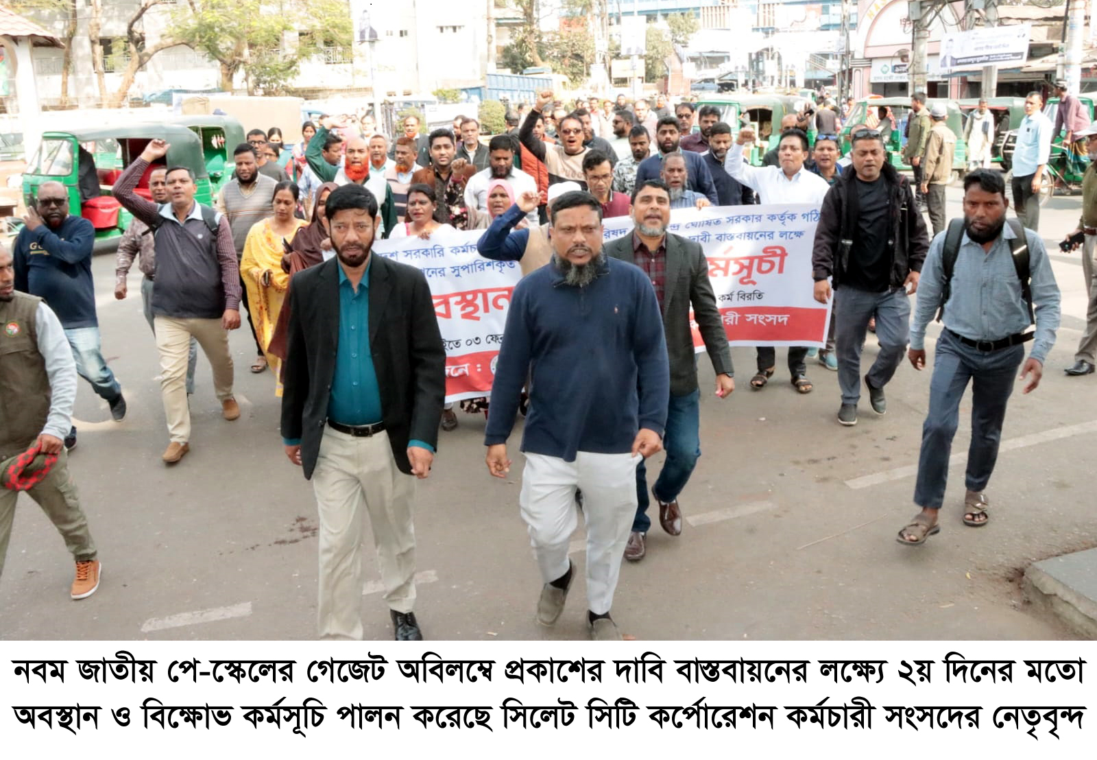 দ্রব্যমূল্যের ঊর্ধ্বগতির সঙ্গে সামঞ্জস্য রেখে নবম জাতীয় পে-স্কেলের গেজেট অবিলম্বে প্রকাশের দাবি বাস্তবায়নের লক্ষ্যে ২য় দিনের মতো অবস্থান ও বিক্ষোভ কর্মসূচি পালন করেছে সিলেট সিটি কর্পোরেশন কর্মচারী সংসদ (রেজিঃ চট্ট-১৭০৪)।