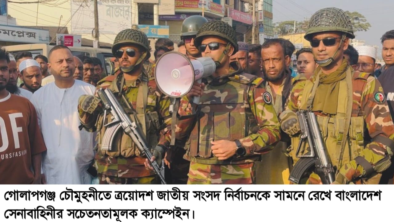 গোলাপগঞ্জ প্রতিনিধি : ত্রয়োদশ জাতীয় সংসদ নির্বাচন অবাধ, সুষ্ঠু ও নিরপেক্ষ করতে গোলাপগঞ্জ আর্মি ক্যাম্পের পক্ষ থেকে সচেতনতামূলক ক্যাম্পেইন অনুষ্ঠিত হয়েছে।