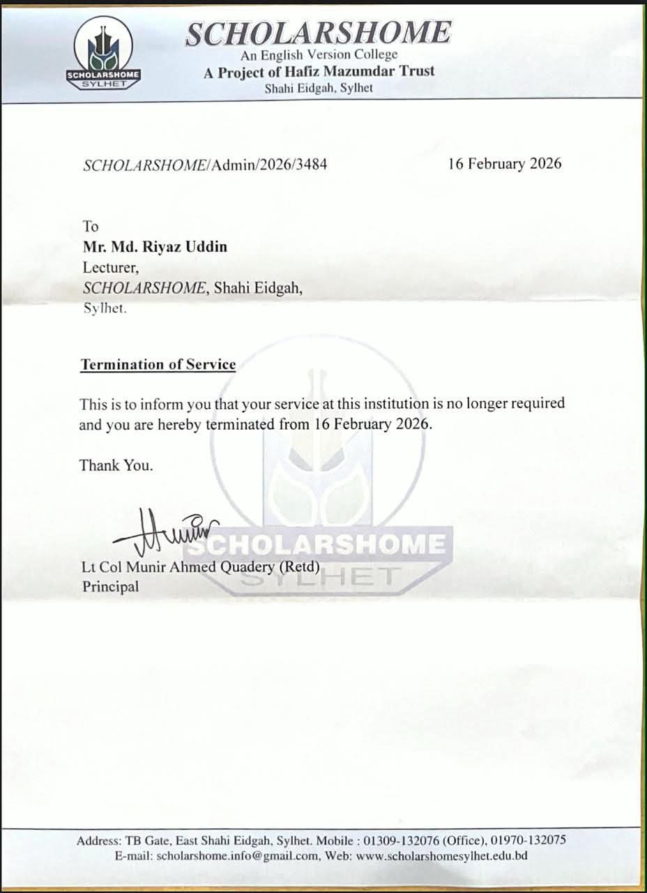 সিলেটের স্বনামধন্য শিক্ষা প্রতিষ্ঠান স্কলার্সহোম-এর একজন শিক্ষককে বহিষ্কার (সাসপেন্ড) করার অভিযোগ উঠেছে। নির্বাচনী আচরণবিধি লঙ্ঘনের প্রতিবাদ করায় তাকে এই শাস্তির মুখোমুখি হতে হয়েছে বলে ভুক্তভোগী শিক্ষক দাবি করেছেন।