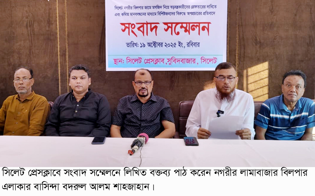 সংবাদ সম্মেলনে লিখিত বক্তব্য দেন সিলেট নগরের লামাবাজার বিলপার এলাকার বাসিন্দা ব্যবসায়ী বদরুল আলম শাহজাহান। এ সময় বিলপার জামে মসজিদের মোতাওয়াল্লী আমেরিকা প্রবাসী হাফিজুল ইসলাম পিন্টুসহ এলাকার মুরব্বী ও মসজিদের মুসল্লীগণ উপস্থিত ছিলেন।