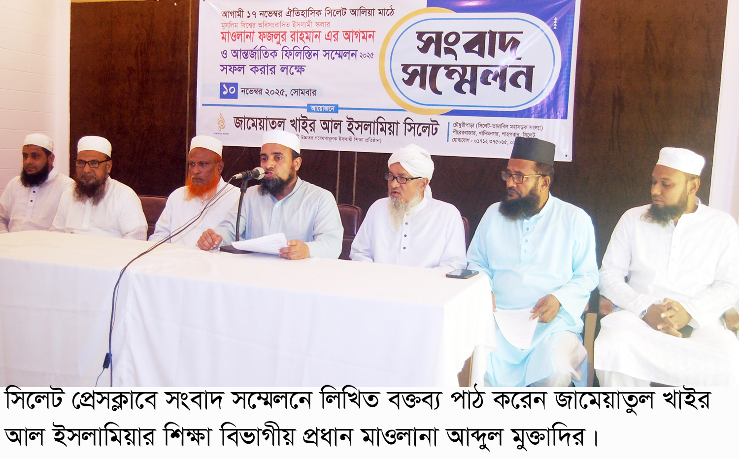 সংবাদ সম্মেলনে উচ্চতর গবেষণামূলক ইসলামী শিক্ষা প্রতিষ্ঠান জামেয়াতুল খাইর আল ইসলামিয়া সিলেটের ভারপ্রাপ্ত পরিচালক শাহ মুহাম্মদ নজরুল ইসলামসহ উলামায়ে কেরামগণ উপস্থিত ছিলেন।
