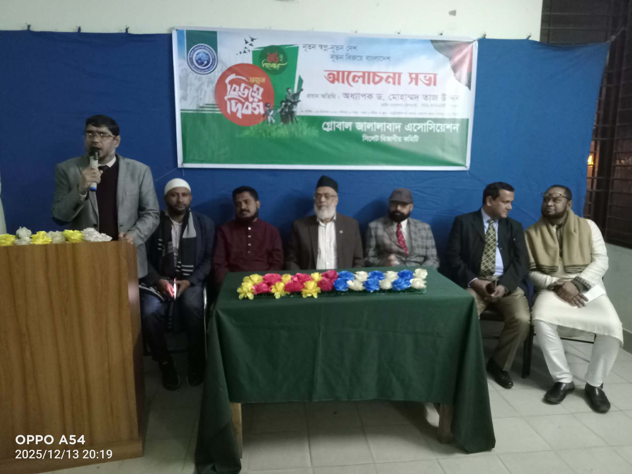 মহান বিজয় দিবস শ্রদ্ধা, দেশপ্রেম ও কৃতজ্ঞতার আবেগে স্মরণীয় করে রাখতে গ্লোবাল জালালাবাদ এসোসিয়েশন, সিলেট বিভাগীয় কমিটির উদ্যোগে গত ১৩ ডিসেম্বর, ২০২৫ এক আলোচনা সভা অনুষ্ঠিত হয়। সিলেট নগরীর মেট্রোপলিটন ল' কলেজের সভাকক্ষে আয়োজিত এ অনুষ্ঠানে মুক্তিযুদ্ধের ত্যাগ, বিজয়ের চেতনা এবং স্বাধীনতার অর্জনকে নতুন প্রজন্মের কাছে তুলে ধরতে বিভিন্ন কর্মসূচি গ্রহণ করা হয়। কবি কামাল আহমদের পবিত্র কুরআন তেলাওতের মাধ্যমে শুরু হওয়া সভায় সভাপতিত্ব করেন সংগঠনের সভাপতি প্রিন্সিপাল কর্নেল (অব.) এম আতাউর রহমান পীর। তিনি তাঁর বক্তব্যে বলেন, “বিজয় দিবস বাঙালি জাতির আত্মমর্যাদা, অধিকার ও স্বাধীনতার প্রতীক। শহীদদের রক্তে রঞ্জিত এই বিজয়কে ধারণ করে দেশকে এগিয়ে নিতে সবাইকে ঐক্যবদ্ধ হতে হবে।” অনুষ্ঠানের প্রধান অতিথি ছিলেন লিডিং ইউনিভার্সিটির উপাচার্য প্রফেসর ড. তাজ উদ্দীন। তিনি তাঁর বক্তব্যে মুক্তিযুদ্ধের ইতিহাস, অসাম্প্রদায়িক মূল্যবোধ এবং জাতীয় উন্নয়নে দায়িত্ববোধের গুরুত্ব তুলে ধরেন। তিনি বলেন, “বিজয়ের চেতনা মানে ভবিষ্যতের প্রতি দায়বদ্ধতা। সত্য, সততা ও মানবিকতা—এই তিন ভিত্তির ওপর দাঁড়িয়ে একটি উন্নত বাংলাদেশ গড়ে উঠতে পারে।” তিনি তরুণদের মুক্তিযুদ্ধের প্রকৃত ইতিহাস জানার এবং সমাজ পরিবর্তনে সক্রিয় হওয়ার আহ্বান জানান। কবি ও সাংবাদিক হেলাল নির্ঝরের সঞ্চালনায় অনুষ্ঠিত সভায় স্বাগত বক্তব্য রাখেন এসোসিয়েশনের মফিক আহমদ । অন্যান্যদের মধ্যে বক্তব্য রাখেন সর্নবজনাব বদরুল ইসলাম চৌধুরী বদর, প্রচার সম্পাদক, এডভোকেট সৈয়দ কাউসার আহমদ, অধ্যক্ষ কামরুল হক, শিক্ষাবিদ নেছারুল হক চৌধুরী বুস্তান, সাধারণ সম্পাদক বায়েজীদ মাহমুদ ফয়সল। বক্তারা শহীদদের ত্যাগ, মুক্তিযুদ্ধের মূল্যবোধ এবং স্বাধীনতার পর দেশ গঠনে সম্মিলিত প্রচেষ্টার প্রয়োজনীয়তা তুলে ধরেন। তাঁরা বলেন, “বিজয় দিবস আমাদের অনুপ্রাণিত করে সৎ, দায়িত্বশীল ও দেশপ্রেমিক হতে। সমাজের প্রতিটি স্তরে মুক্তিযুদ্ধের আদর্শ বাস্তবায়িত হোক—এটিই আমাদের প্রত্যাশা।” আলোচনা সভায় মুক্তিযুদ্ধের বীরত্বগাঁথা, শহীদদের স্মৃতি ও স্বাধীনতার মাহাত্ম্য তুলে ধরে হৃদয়স্পর্শী উপস্থাপনা করা হয়। শহীদদের স্মরণে এক মিনিট নীরবতা পালন করা হয় এবং তাদের আত্মার মাগফিরাত কামনায় দোয়া পরিচালিত হয়। বক্তারা বলেন, ইতিহাস ভুলে গেলে জাতি পথ হারায়—তাই পরবর্তী প্রজন্মকে সত্যিকার ইতিহাস জানানো অত্যন্ত জরুরি। অনুষ্ঠানে গ্লোবাল জালালাবাদ এসোসিয়েশনের চলমান সামাজিক ও মানবিক কার্যক্রম, শিক্ষা সহযোগিতা, সহায়তামূলক প্রোগ্রাম এবং ভবিষ্যৎ পরিকল্পনাও তুলে ধরা হয়। সংগঠনের নেতৃবৃন্দ শিক্ষা খাতে সহায়তা বৃদ্ধি, ম