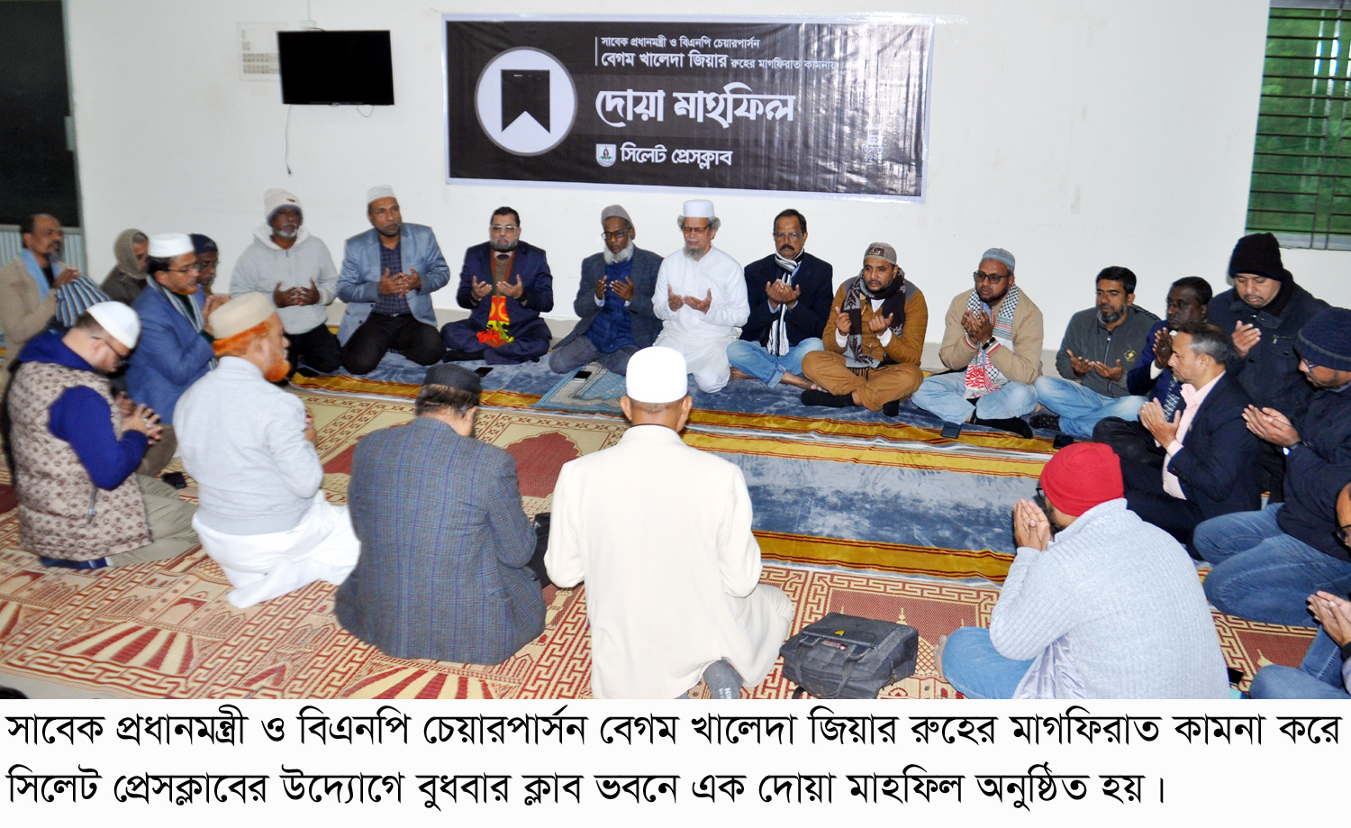সাবেক প্রধানমন্ত্রী ও বিএনপি চেয়ারপার্সন বেগম খালেদা জিয়ার রুহের মাগফেরাত কামনা করে সিলেট প্রেসক্লাবের উদ্যোগে বুধবার (৩১ ডিসেম্বর) বাদ আছর ক্লাব ভবনে এক দোয়া মাহফিল অনুষ্ঠিত হয়। দোয়া ও মিলাদ মাহফিলের পুর্বে সংক্ষিপ্ত বক্তব্যে বক্তারা বলেন, বেগম খালেদা জিয়া ছিলেন স্বাধীনতা, সার্বভৌমত্ব ও জাতীয় ঐক্যের প্রতীক। তিনি রাজনীতি, দল-মত, মতাদর্শ সবকিছুর ঊর্ধ্বে উঠে, রাজনৈতিক অভিভাবকে পরিণত হয়েছিলেন। তিনি শুধুমাত্র একটি রাজনৈতিক দলের নেত্রীই ছিলেন না, তিনি ছিলেন বাংলাদেশের রাজনৈতিক দলগুলোর ঐক্য ও বিশ্বাসের প্রতীক।