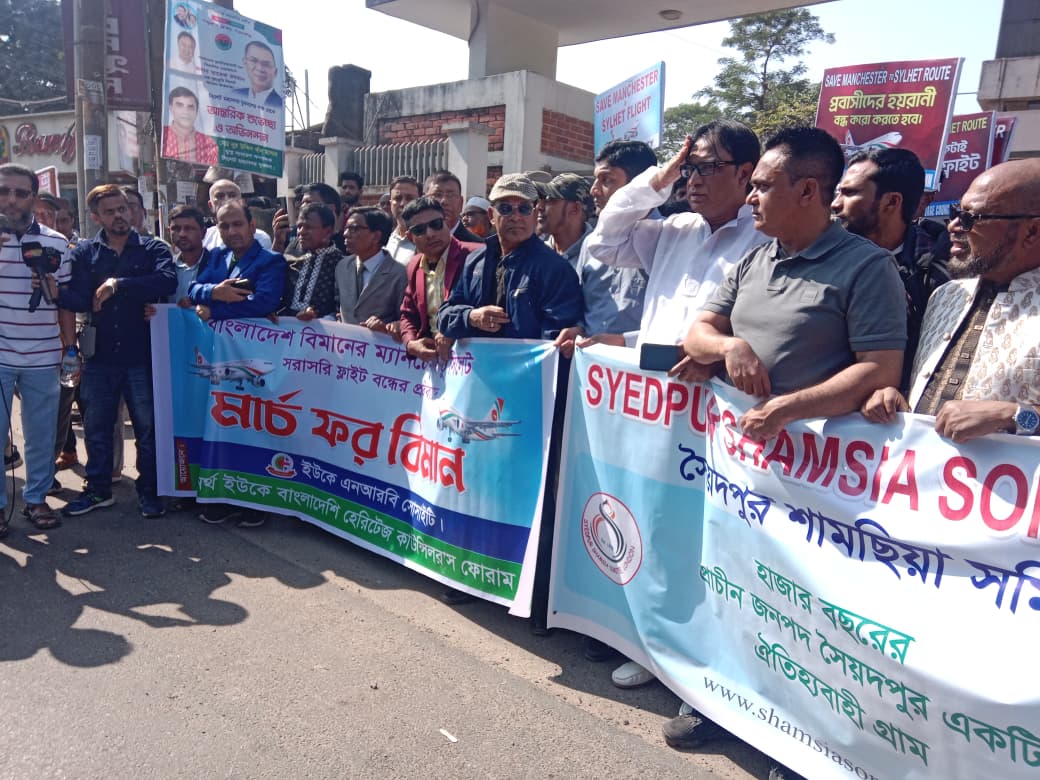 দুপুর ১২টার দিকে ‘ইউকে এনআরবি সোসাইটি ও ইউকে বাংলাদেশি হেরিটেজ কাউন্সিলর ফোরাম’–এর উদ্যোগে নগরের চৌহাট্টা থেকে ‘মার্চ ফর বিমান’ কর্মসূচি শুরু হয়। এ কর্মসূচিতে যুক্তরাজ্য প্রবাসীসহ সিলেটের বিভিন্ন শ্রেণি-পেশার প্রতিনিধিরা অংশ নেন। প্রায় দেড় কিলোমিটার হেঁটে তাঁরা বিমান অফিসের সামনে গিয়ে সমাবেশে মিলিত হন। এ সময় সিলেট-ম্যানচেস্টার ফ্লাইট চালু না রাখলে প্রবাসীরা রেমিট্যান্স স্ট্রাইক ও বিমান বর্জনের মতো কর্মসূচির হুঁশিয়ারি দেন।ইউকে এনআরবি সোসাইটির পরিচালক মিজানুর রহমানের সঞ্চালনায় সমাবেশে প্রধান অতিথির বক্তব্য দেন সিলেট মহানগর বিএনপির ভারপ্রাপ্ত সভাপতি রেজাউল হাসান কয়েস লোদী। এ সময় ইউকে এনআরবি সোসাইটির পরিচালক এম আহমদ জুনেদ, যুক্তরাজ্যের ওল্ডহাম বিএনপির প্রতিষ্ঠাতা সভাপতি জামাল উদ্দিন, ইউকে এনআরবি সোসাইটির পরিচালক ইসমাইল হোসেন ও মোতালিব চৌধুরী, যুক্তরাজ্যের কমিউনিটি নেতা বুলবুল আমিন, বদরুল আলম, দবির মল্লিক, জামান মিয়া, রাসেল চৌধুরী, নুরুল আমিন, মাসুক উদ্দিন, শাহাব উদ্দিন, আবদুস শহীদ প্রমুখ বক্তব্য দেন।